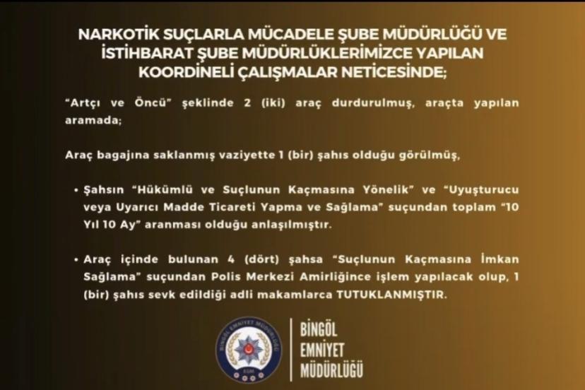 Bingöl’de polis ekiplerince durdurulan araçta bagaja gizlenmiş halde bulunan ve 10 yıl 10 ay hapis cezasıyla aranan şahıs yakalandı.