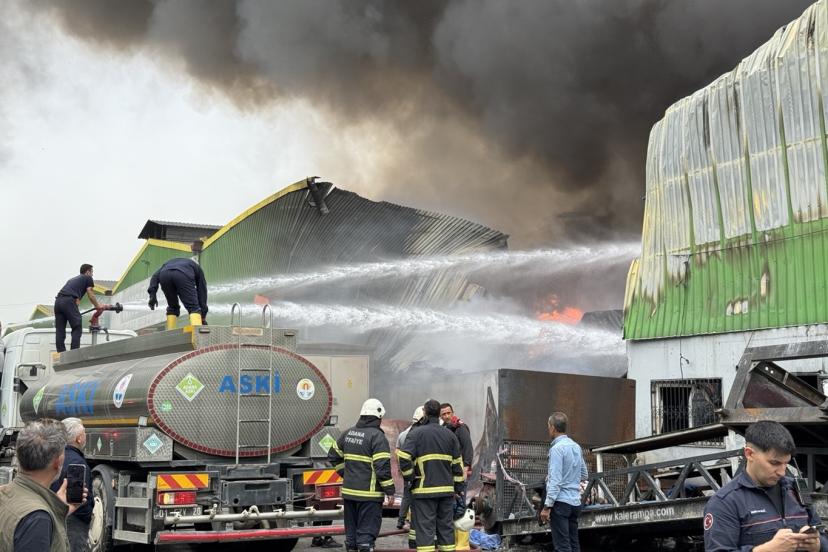 Adana'nın merkez Seyhan ilçesinde geri dönüşüm tesisinde çıkan yangına müdahale ediliyor.