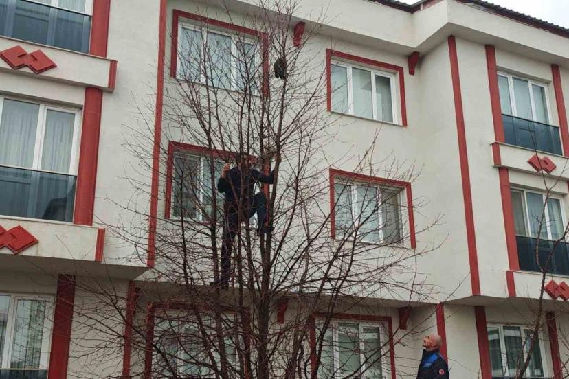 Erzurum’un Aziziye ilçesinde ağaca çıkarak mahsur kalan kedi, zabıta ekiplerinin müdahalesiyle sağ salim kurtarıldı.