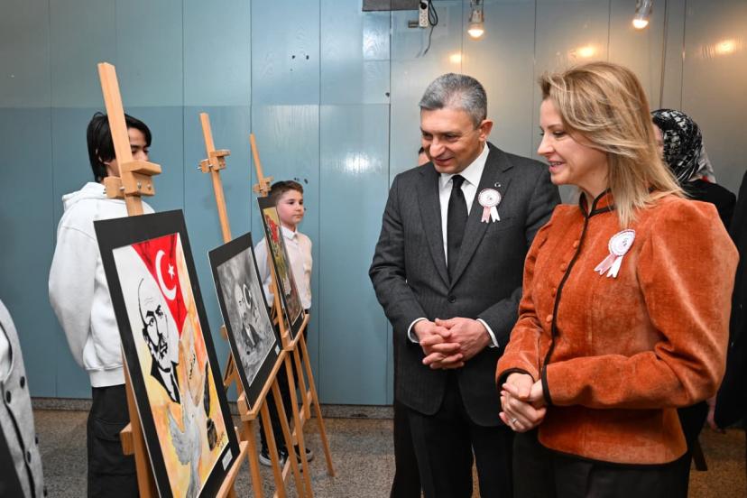 Programın sonunda Vali Hulusi Şahin, Atatürk Kültür Merkezi fuaye alanında Antalya Anadolu İmam Hatip Lisesi öğretmen ve öğrencileri tarafından hazırlanan resim ve el sanatları sergisini gezdi.