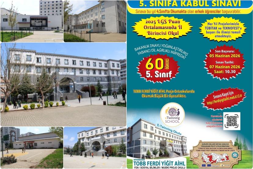 Diyarbakır TOBB Ferdi Yiğit Anadolu İmam Hatip Ortaokulu, 60 öğrenci kontenjanıyla 5'inci sınıf kabul sınavı için başvuruları sürüyor. Okulda, akademik başarı ile birlikte yabancı dil ve rehberlik destekli eğitim modeli uygulanıyor.