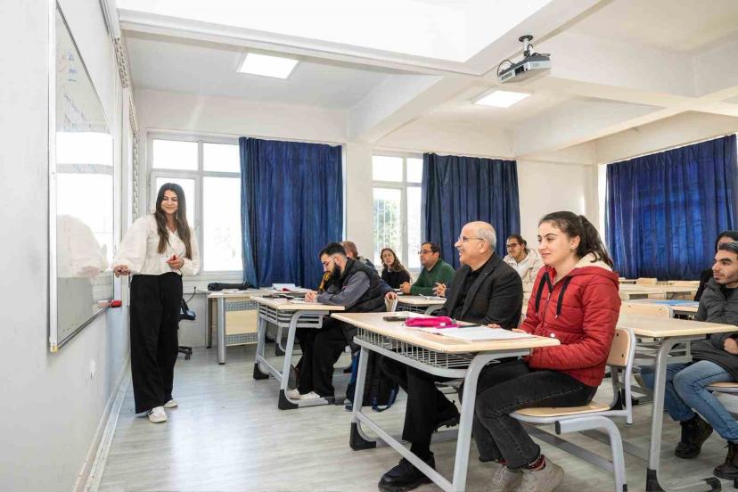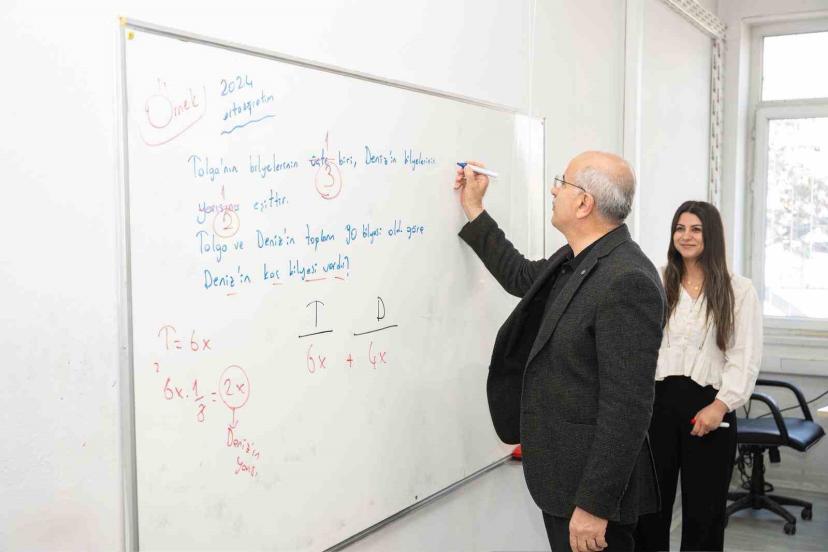 Matematik dersine kursiyerlerle birlikte katılan Başkan Er, ayrıca kursiyerlerle birlikte tahtada denklem sorusunu da çözdü.