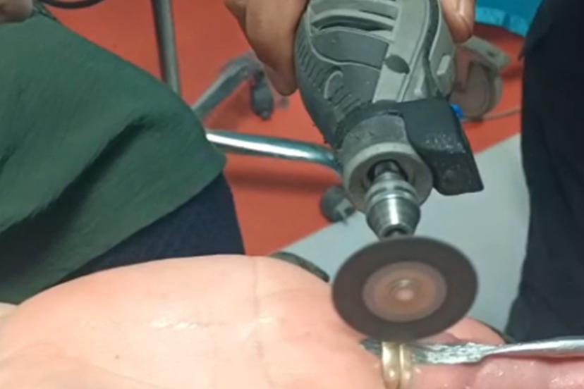 Hastaneye gelen itfaiye ekipleri, doktor kontrolü ve gözetiminde özel ekipman kullanarak sıkışan yüzüğü dikkatli bir şekilde çıkardı.