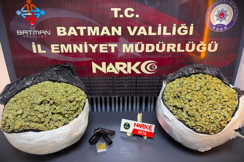 Batman'da şüpheli araçlara yönelik operasyonda 9 kilo 400 gram skunk, ruhsatsız tabanca ve fişek ele geçirildi, 4 şüpheliden 2'si tutuklandı.