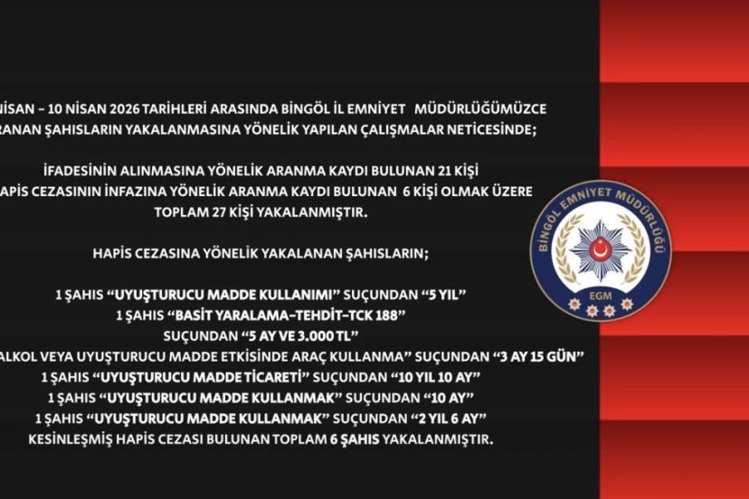 Bingöl İl Emniyet Müdürlüğü ekiplerince, 03 Nisan - 10 Nisan 2026 tarihleri arasında aranan şahısların yakalanmasına yönelik gerçekleştirilen çalışmalar kapsamında önemli sonuçlar elde edildi. Yapılan çalışmalarda, ifadesinin alınmasına yönelik aranan 21 kişi ile kesinleşmiş hapis cezası bulunan 6 kişi olmak üzere toplam 27 şahıs yakalandı.
