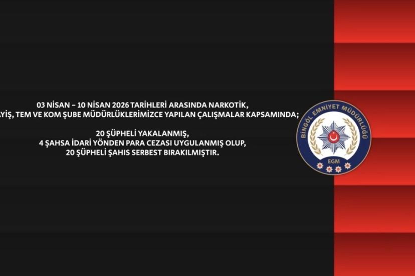 Öte yandan aynı tarihler arasında narkotik, asayiş, Terörle Mücadele (TEM) ve Kaçakçılık ve Organize Suçlarla Mücadele (KOM) şube müdürlüklerince yürütülen çalışmalar kapsamında 20 şüpheli yakalandı. 4 şahsa idari para cezası uygulanırken, 20 şüpheli şahıs işlemlerinin ardından serbest bırakıldı.