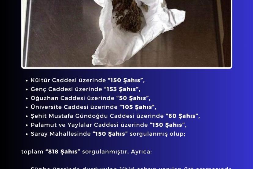 Bingöl’de polis ekiplerince yapılan denetimlerde 818 kişi sorgulanırken, 1 şahsın üzerinde uyuşturucu madde ele geçirildi.