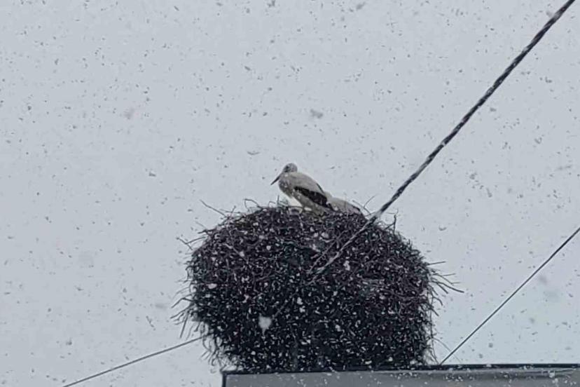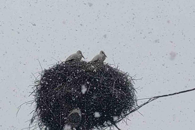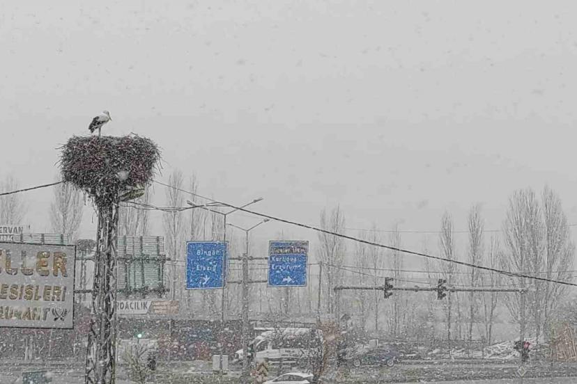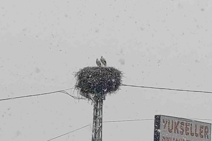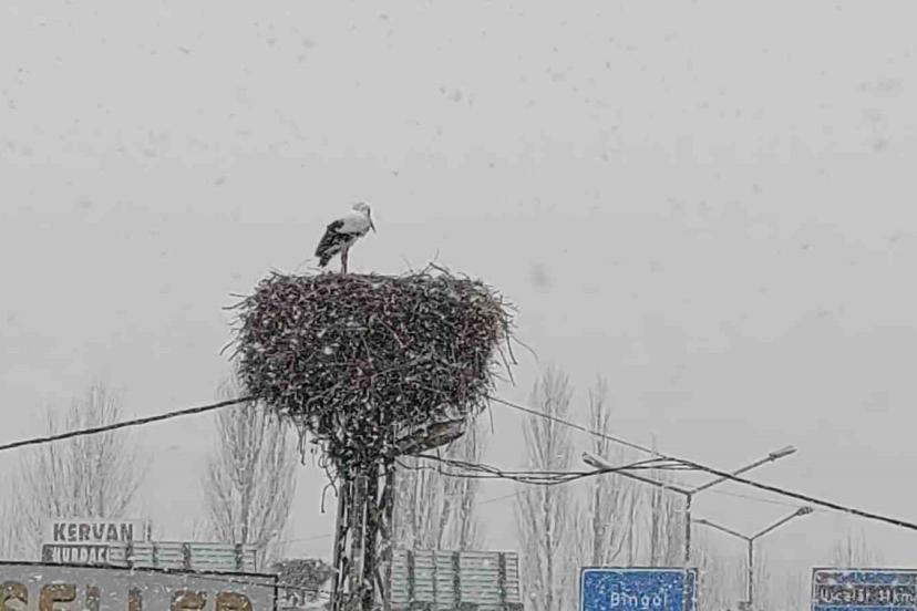 Baharın habercisi olarak bilinen leylekler, Bingöl’e erken gelince kar yağışına yakalandı.
