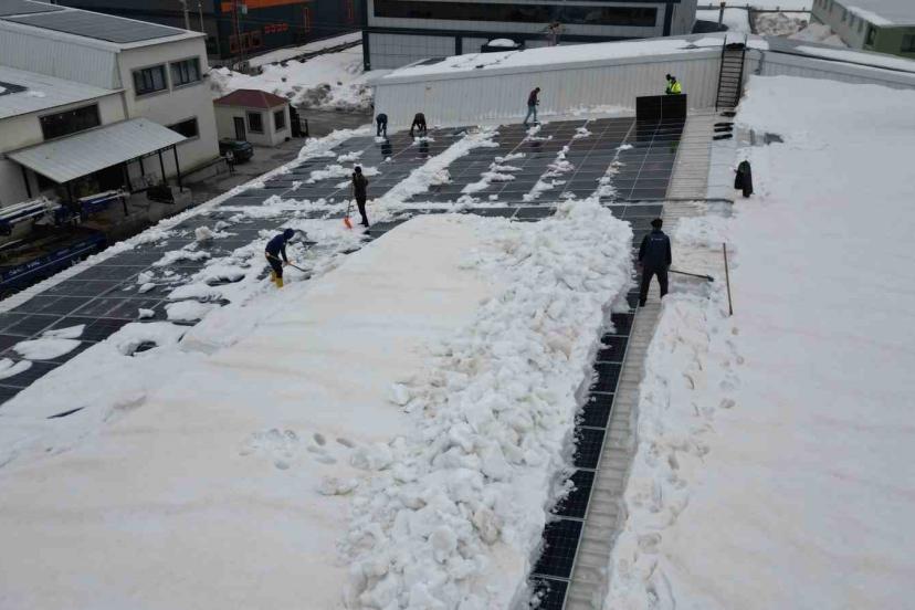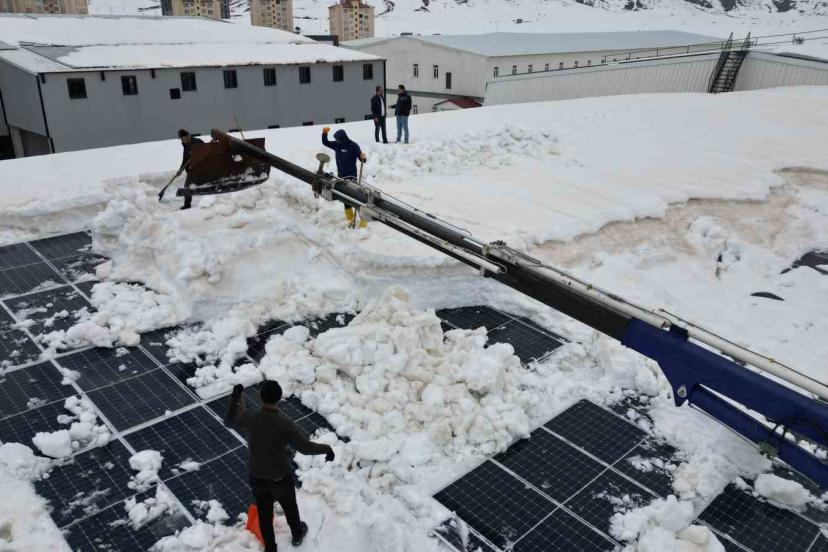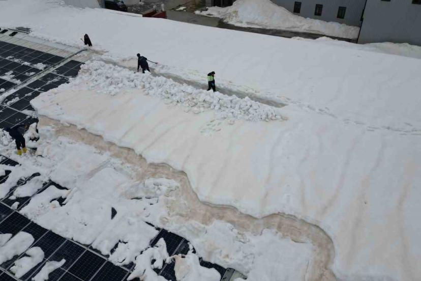 Vinç, ucundaki özel aparat, adeta bir iş makinesinin kepçesi gibi çalışarak tonlarca karı güvenli bir şekilde aşağı indiriyor. Bu yöntemle hem iş güvenliği sağlanıyor hem de geniş alanlarda temizlik hızlı bir şekilde tamamlanabiliyor. Tekstil firması yetkilisi Maşallah Sarı, uzun uğraşlar sonucunda insan gücü ile temizlenemeyecek olan karları özel bir vinç ve aparatla 2 günde temizlediklerini belirterek, "Bu seneki yoğun kar yağışından dolayı çatı temizliğini insan gücüyle yapamadık. Bu sebeple yeni bulmuş olduğumuz vincimizin ağzına bir aparat sistemi taktık. Ortalama şu anki kar kütlesi 1,5-2 metre. İnsan gücünü aştığından dolayı vinç ağzına bir aparatla buradaki karı temizledik. Tabii ki buradaki karı temizlerken güneş panellerinin zarar görmemesi açısından uç kısımlarına güçlü bir plastik mekanizma taktık. Şu an mevcut olan güneş panellerimizin zaten tamamı zarar görmüş durumda. Kar yağışından dolayı bu ikinci temizliğimizdir. Umarım bundan sonraki dönemde de kar yağışı bu kadar etkili ve zarar görecek bir düzeyde olmaz" dedi.