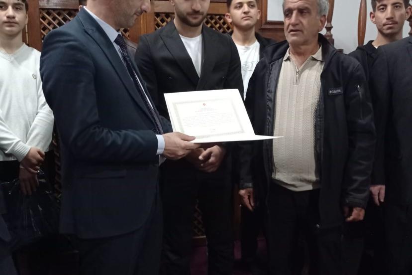 Ziyaret kapsamında, hafızlığını tamamlayan bir öğrenci belge takdim töreni düzenlendi. Genç hafıza Hafızlık Belgesi’ni bizzat takdim eden Dr. Sebahattin Erdoğan, hafızlığın sadece bir ezber değil, bir ömür boyu taşınacak mukaddes bir emanet olduğunu vurguladı.
