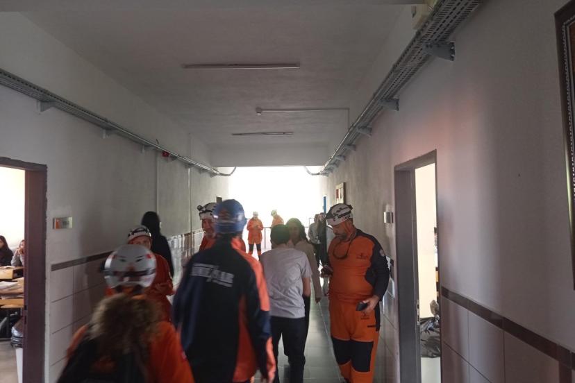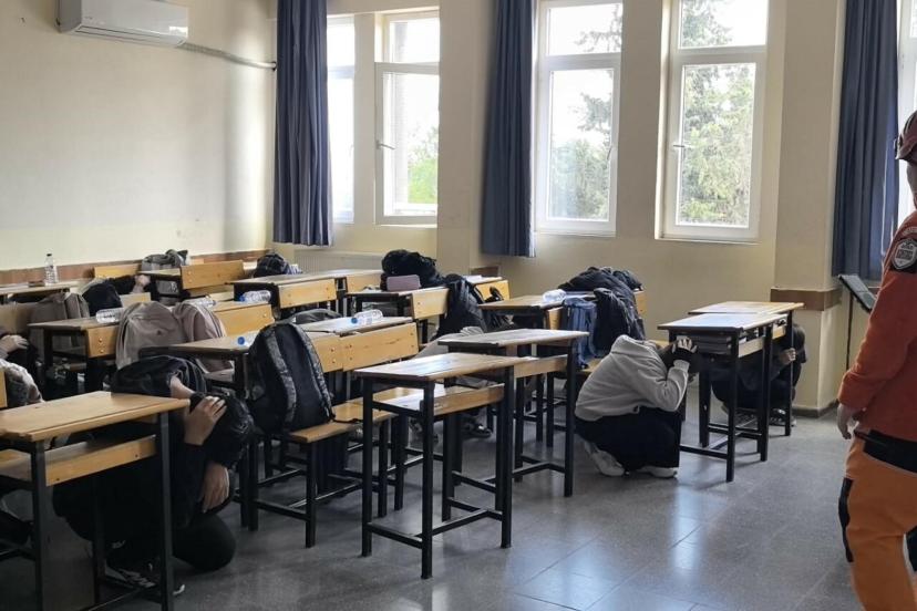 Senaryo gereği çalan alarm ile birlikte öğrencilerin öğretmenleri rehberliğinde doğru korunma pozisyonunu almaları sağlandı ve kontrollü şekilde tahliye süreci gerçekleştirildi.