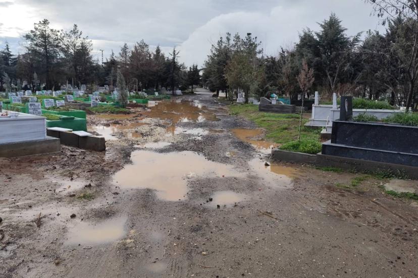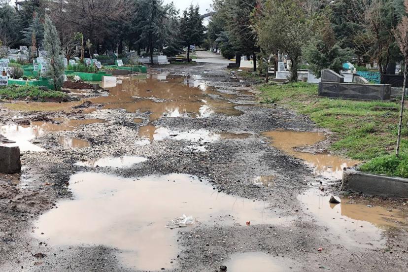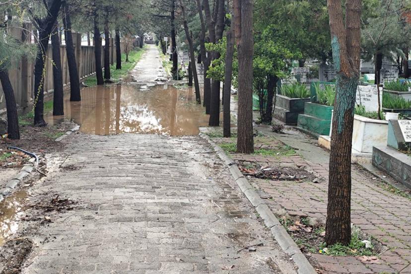 Kentin en büyük mezarlığı olan Yeniköy Mezarlığında her yağış sonrası aynı manzara yaşanırken, vatandaşlar mezarlıkta herhangi bir önlem alınmamasına tepki gösterdi.