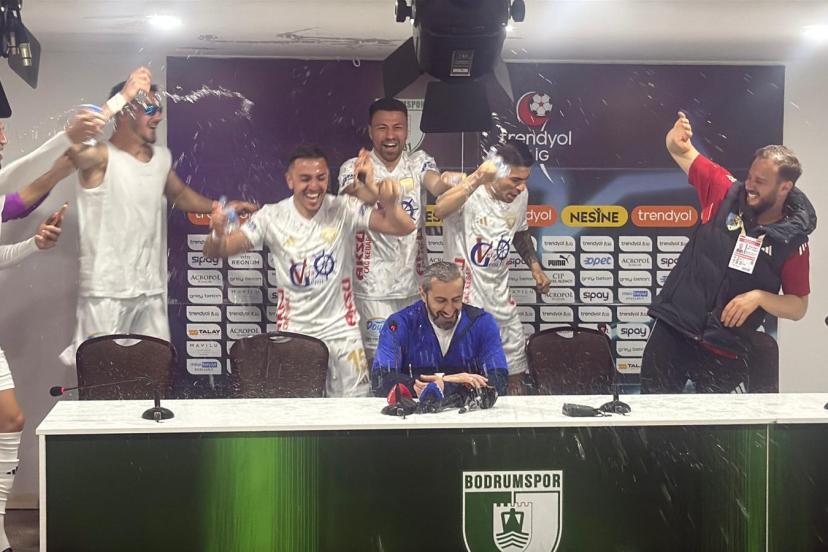 1’inci Lig’de Bodrum FK ile deplasmanda 1-1 berabere kalarak bitime 2 hafta kala 5 yıl sonra Süper Lig’e yükselmeyi garantileyen Erzurumspor’da, karşılaşma sonrası düzenlenen basın toplantısında teknik direktör Serkan Özbalta’ya futbolcularından sürpriz geldi. Toplantı sırasında içeri giren Erzurumsporlu futbolcular, gelenek gereği Özbalta’yı su şişeleriyle ıslatarak şampiyonluğu birlikte kutladı. Tecrübeli teknik adam, bu sürprizin ardından basın toplantısına yeniden başladı.