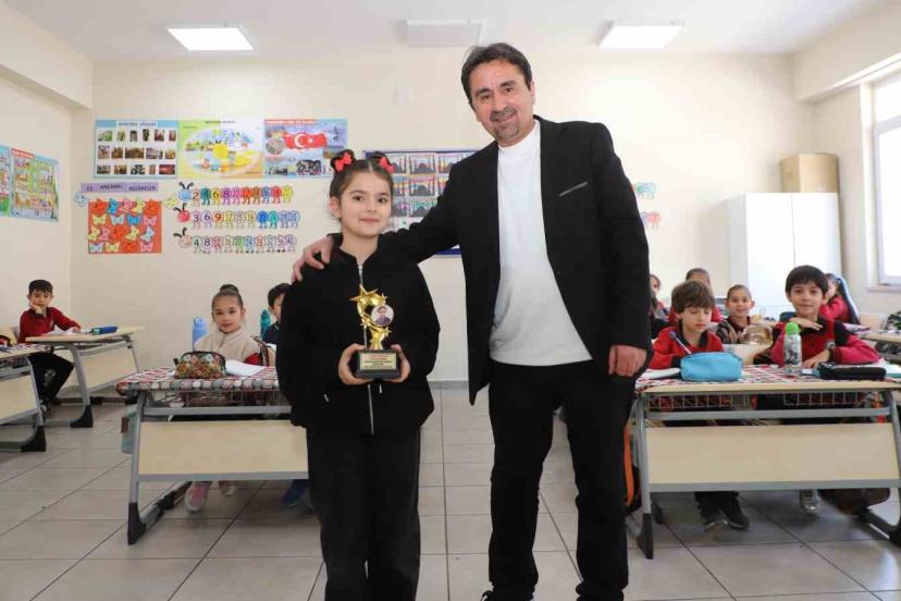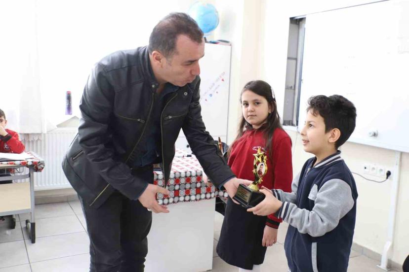 Müdür Ecer, öğrencileri tebrik ederek sınavda birinci olan Jinda Özkan, Alya Şahin ve Emir Sönmez’e özel tasarımlı kupalarını taktim etti. Jinda Özkan ise emeği geçen sınıf öğretmeni ve okul yönetimine teşekkür etti.