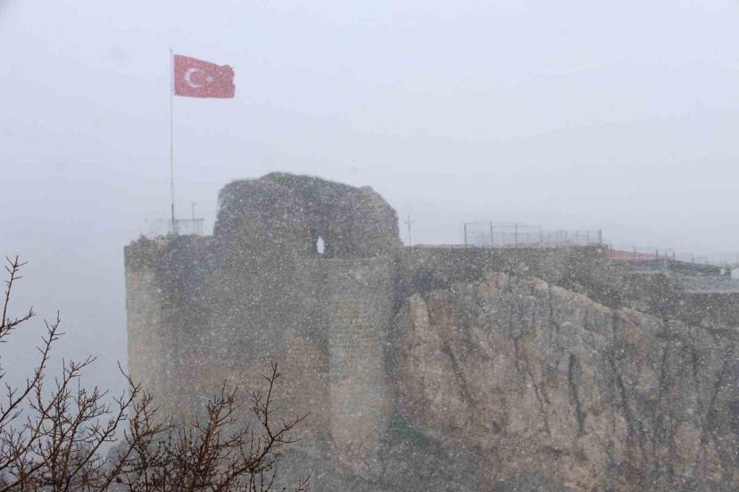 Elazığ’ın 4 bin yıllık tarihi Harput Mahallesi’nde etkisini artıran kar yağışı, tarihi mekanları kısmen beyaza bürüdü.