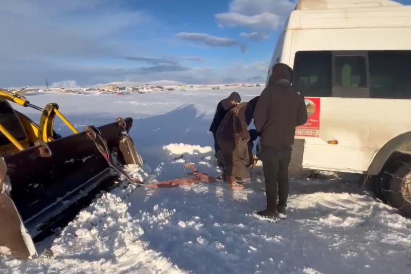 Kar kalınlığının yer yer yarım metreyi bulduğu yolda iş makineleriyle çalışma başlatan ekipler, saatler süren mücadelenin ardından minibüsü çekerek saplandığı yerden çıkardı.