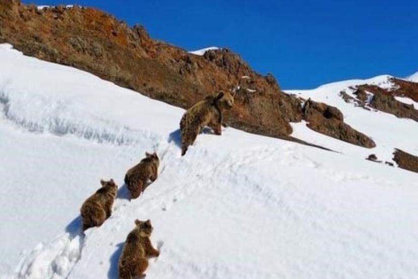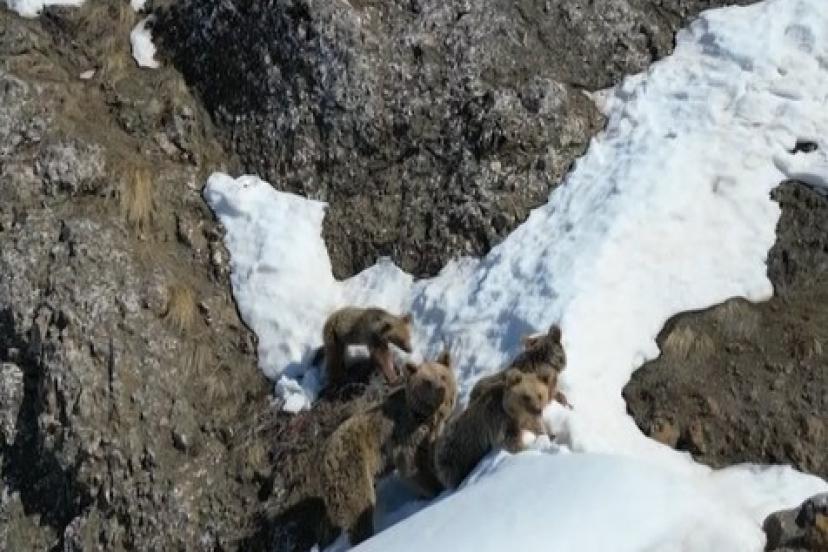 Bingöl’de kış uykusundan uyanarak karla kaplı arazide dolaşan ayı ve üç yavrusu dron ile görüntülendi.