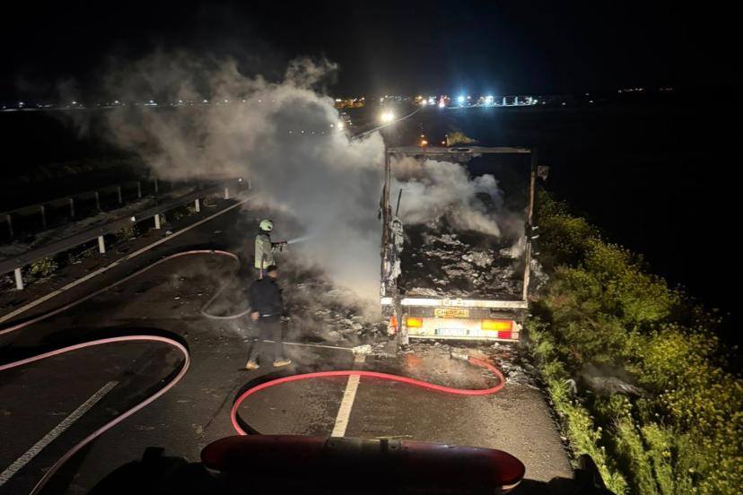 Mardin’in Nusaybin ilçesi uluslararası İpekyolu üzerinde, seyir halindeki bir tır'ın dorsesi alev alarak yandı.