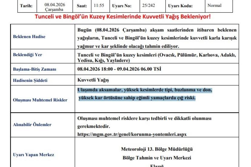 Meteoroloji 13. Bölge Müdürlüğü tarafından yapılan açıklamada, "Bugün (08.04.2026 Çarşamba) akşam saatlerinden itibaren beklenen yağışların, Tunceli ve Bingöl’ün kuzey kesimlerinde kuvvetli karla karışık yağmur ve kar şeklinde olacağı tahmin ediliyor. Ulaşımda aksamalar, yüksek kesimlerde tipi, buzlanma ve don, yüksek kar örtüsüne sahip eğimli yamaçlarda çığ riskine karşı dikkatli ve tedbirli olunmalıdır" denildi.