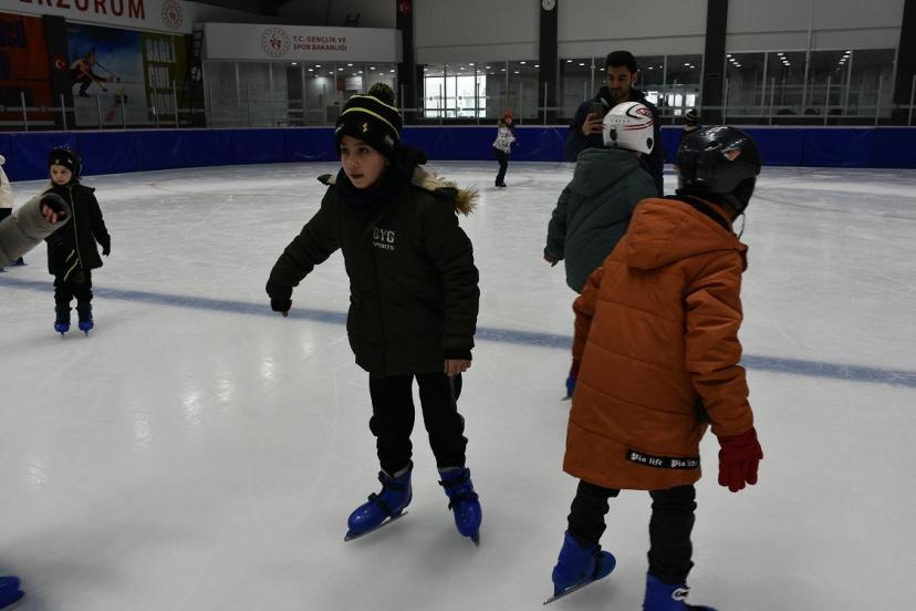 Herkes İçin Spor Federasyonu (HİS) Erzurum Gençlik ve Spor İl Müdürlüğü tarafından başlatılan Kış Sporları Haftası Projesi kapsamında Palandöken Spor Kampüsü 500’lük buz salonunda buz pateni eğitimi alan çocuklara bere dağıttı.