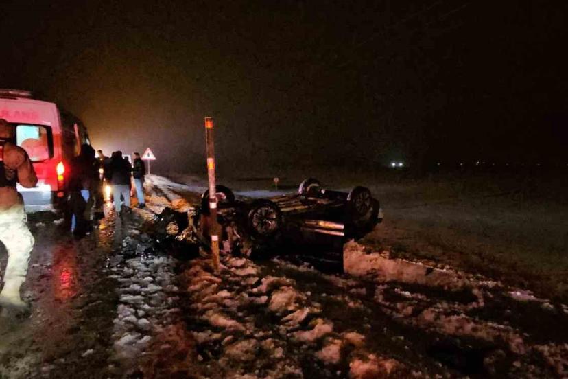 Muş-Erzurum karayolunda karla karışık yağmur nedeniyle kayganlaşan yolda kontrolden çıkan otomobil takla atarak şarampole yuvarlandı.