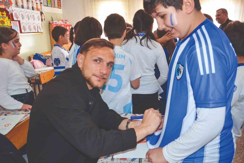 Çocuklarla bir anda sarmaş dolaş olan Kaptan Yumlu ve Sefa Akgün daha sonra giyilen formaları imzaladı ve spor salonunda üç ve dördüncü sınıflarla bir araya geldi. Çocukların birbirinden ilginç sorularını yanıtlayan Kaptan Yumlu ve Akgün, öğretmen ve öğrencilerle bol bol fotoğraf çektirerek forma imzaladı.