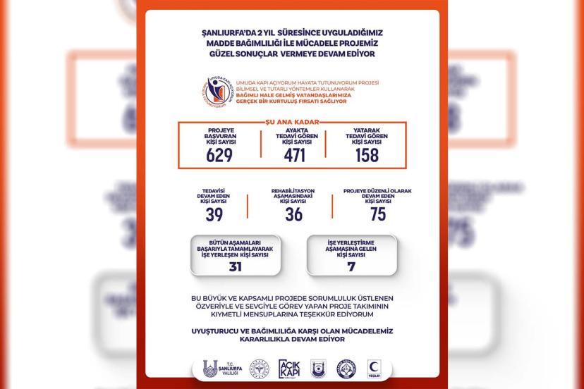 Şanlıurfa’da madde bağımlılığıyla mücadele kapsamında yürütülen ‘Umuda Kapı Açıyorum Hayata Tutunuyorum Projesi’ kapsamında yüzlerce vatandaşın tedavi gördüğü, projeyi tamamlayan bazı kişilerin ise istihdama kazandırıldığı bildirildi.