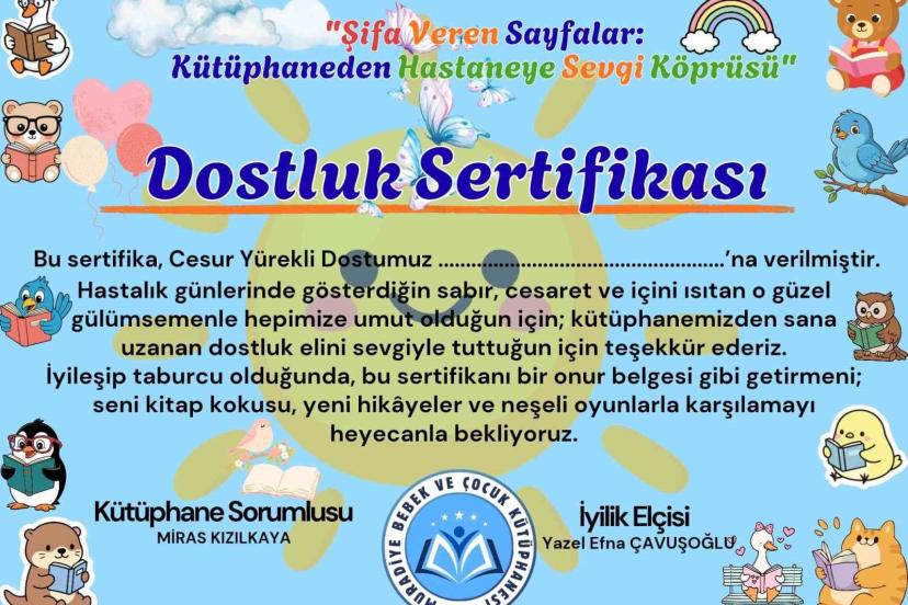 "Bir sayfa çevir, bir kalbe dokun" mottosuyla yola çıkan proje kapsamında; kütüphane üyesi gönüllü çocuklar, hastanede tedavi gören akranlarına hem kitap şifası hem de moral taşıyor. Türkiye’de bir ilk olma özelliği taşıyan bu çalışmada, kütüphanede kurulan ’İyileştiren Eller Atölyesi’nde bizzat çocuklar tarafından hazırlanan ’İyilik Heybeleri’ ve ’Dostluk Sertifikaları’ hastane odalarına ulaştırılacak. Kütüphaneci rehberliğinde ancak çocukların başrolde olacağı bu modelde; kitapların iyileştirici gücünü temel alan bibliyoterapi yöntemiyle ’İyilik Elçileri’ akranlarına kitap okuyarak hastane ortamını geçici bir kütüphaneye ve sosyal dayanışma merkezine dönüştürecek. Bu sayede okuma eylemi, sadece bir etkinlik olmaktan çıkıp çocukların tedavi sürecine psikolojik destek sağlayan bir şifa aracına dönüşecek.