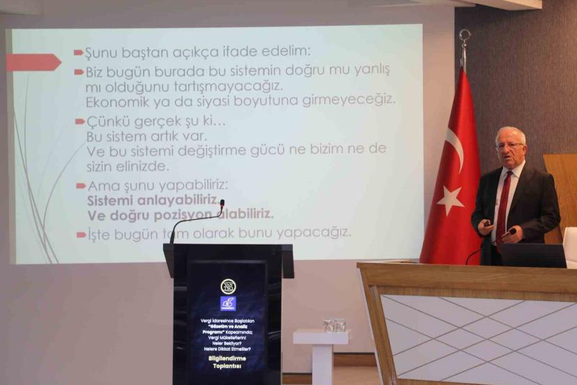 Toplantı; Yeminli Mali Müşavir İlhan Güneri ile Vergi ve Yatırım Danışmanı Eski Maliye Başmüfettişi Mehmet Abanoz’un ’Vergi İdaresi Gözetim ve Analiz Programı’ hakkındaki sunumları ile devam etti. ’Vergi Mükelleflerini Neler Bekliyor?’ ve ’Nelere Dikkat Edilmeli?’ gibi akıllarda yer alan sorularla ilgili bilgilendirmelerin yapıldığı toplantı, soru-cevap bölümü ile son buldu.