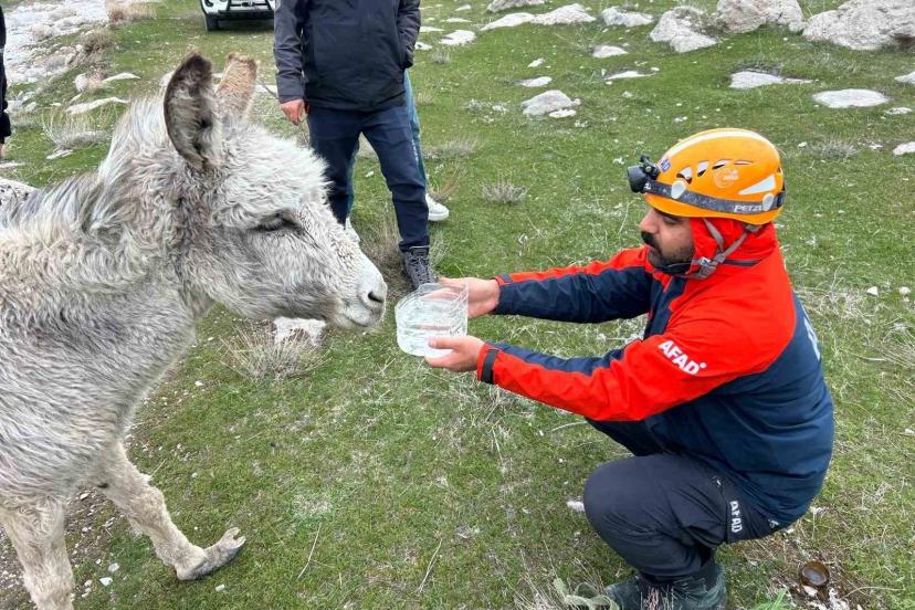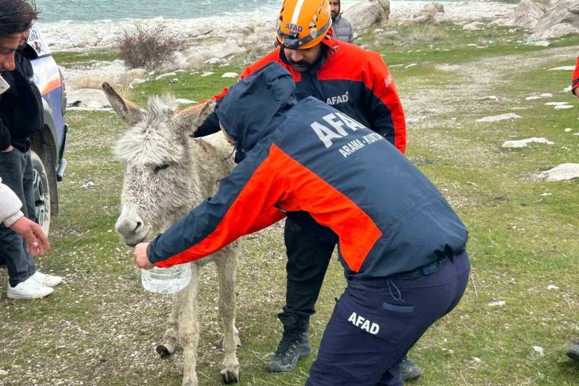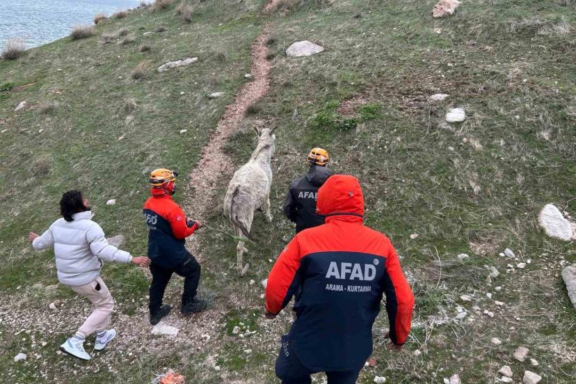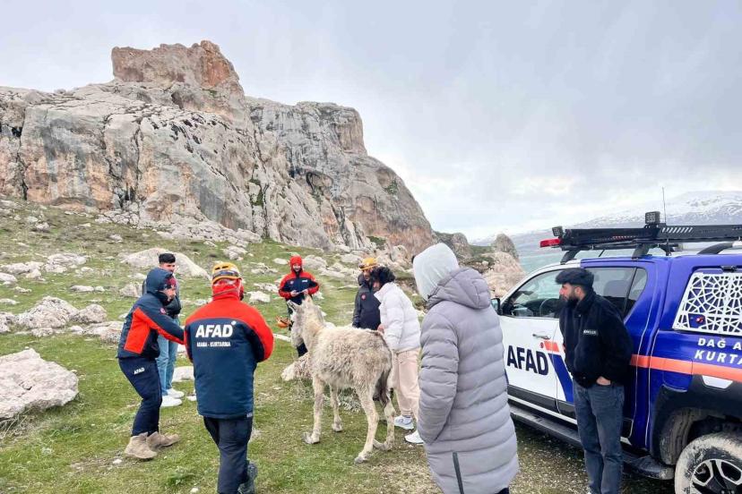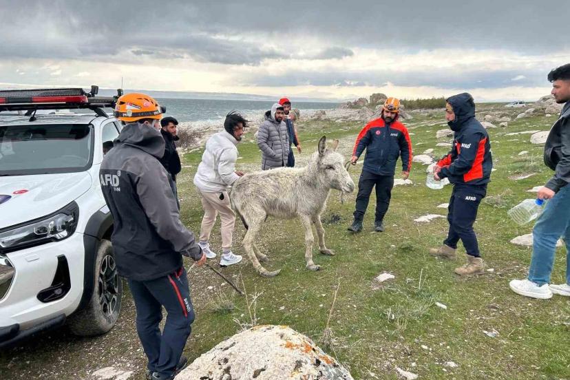Van’ın Tuşba ilçesinde sarp kayalıklarda mahsur kalan bir eşek, AFAD ekiplerinin müdahalesiyle kurtarıldı.