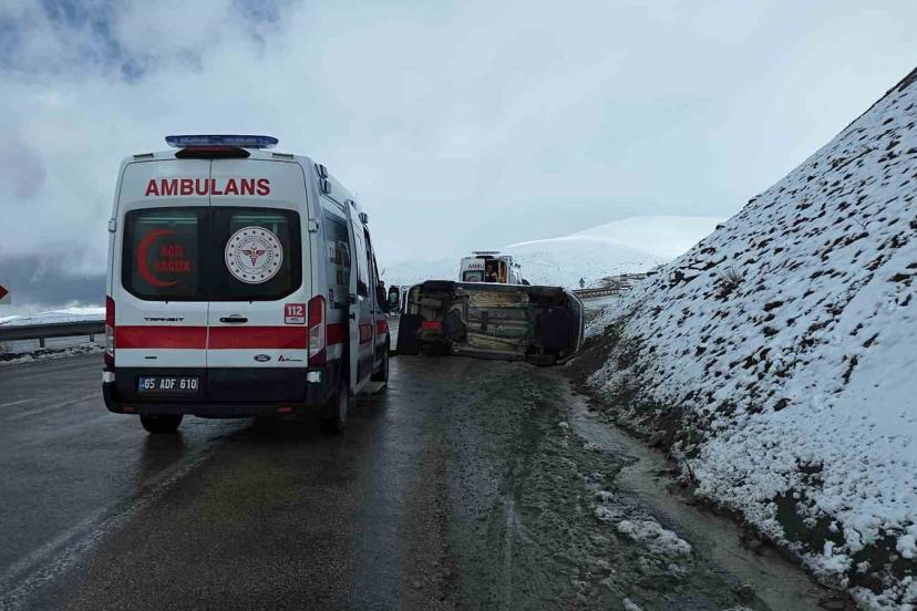 Van’da kaygan yolda devrilen hafif ticari kamyonette 1 kişi yaralanırken sürücü, eşi ve çocuğu yara almadan kurtuldu.