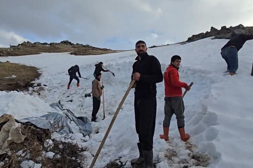 Ağrı Dağı eteklerindeki otlaklara çıkan Bulakbaşı Köyü sakinleri, otlaklarda su olmadığı için yaşanabilecek su sıkıntısına karşı karı depolayarak hayvanları için doğal su kaynağı oluşturuyor.