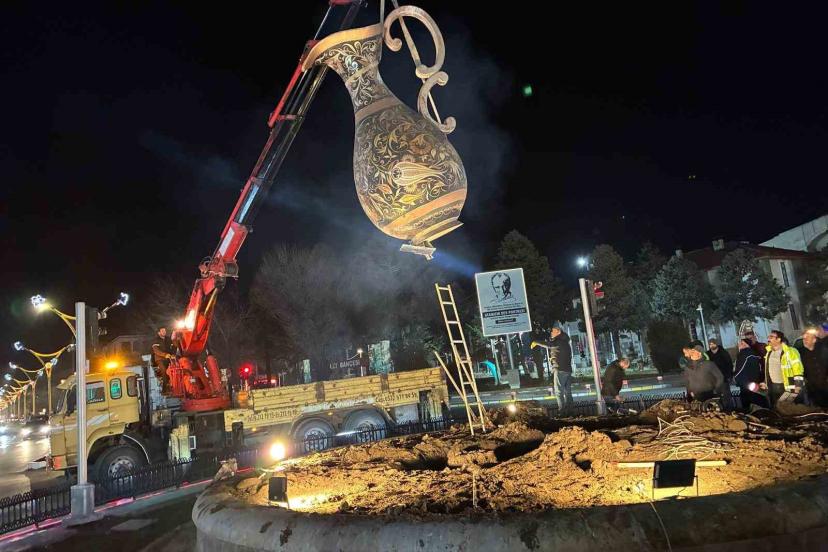 Erzincan’da şehir merkezinin simgelerinden biri olan bakır sürahi, bakım ve onarım çalışmaları kapsamında geçici olarak yerinden kaldırıldı.
