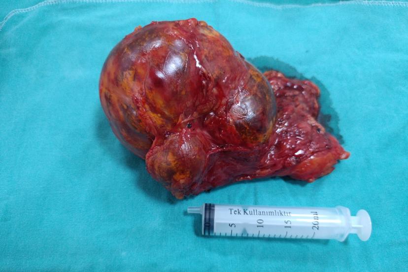 Malatya'da karın ağrısı şikâyetiyle hastaneye başvuran ve sol böbrek üstü bezinde yaklaşık 20 santimetre büyüklüğünde kitle tespit edilen hasta, kapalı (laparoskopik) yöntemle başarılı bir operasyonla kitle alınarak sağlığına kavuştu.