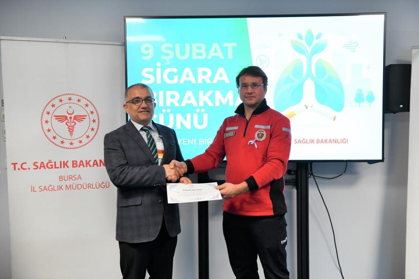 Sigarayı bırakarak iş arkadaşlarına örnek olan firma personeline sertifikaları; Dr. İrfan Oğuz, Uzm. Dr. İsmail Kaba ve Murat Tolga Görgülü tarafından teslim edildi. Yetkililer, bu tür "yerinde" sağlık hizmetlerinin iş verimliliğini artırmasının yanı sıra toplum sağlığı için de kritik bir öneme sahip olduğunu vurguladı.