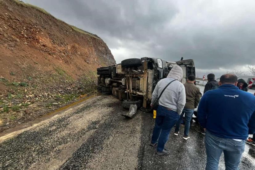Elazığ’da yağıştan dolayı sürücüsünün direksiyon hakimiyetini kaybettiği beton pompa aracı yan yattı.