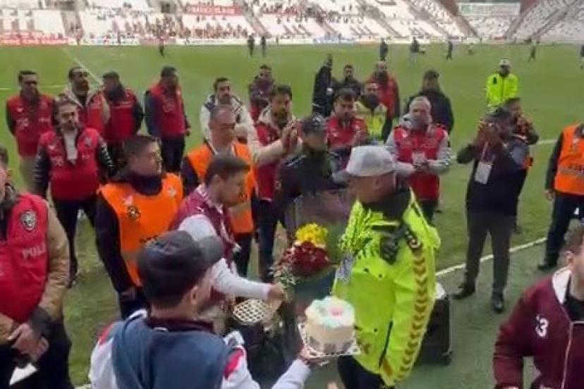 Elazığsporlu taraftarlar, polis haftası sebebiyle stadyumda görev yapan emniyet mensuplarına çiçek ve pasta verdi.