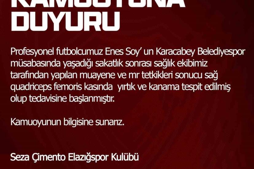 Elazığsporlu Enes Soy sakatlığı nedeniyle Karaman FK maçı kadrosuna dahil edilmedi. Kulüp Enes’in sağlık durumuna ilişkin bir açıklama yayımladı. Açıklamada; "Profesyonel futbolcumuz Enes Soy’un Karacabey Belediyespor müsabakasında yaşadığı sakatlık sonrası sağlık ekibimiz tarafından yapılan muayene ve MR tetkikleri sonucu sağ quadriceps femoris kasında yırtık ve kanama tespit edilmiş olup tedavisine başlanmıştır. Kamuoyunun bilgisine sunarız" denildi.