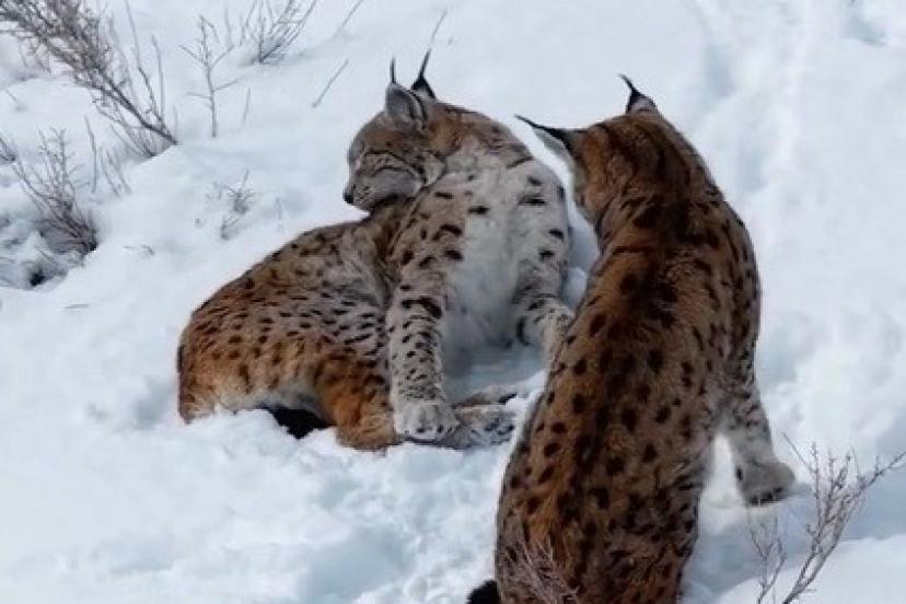 Nesli tükenme tehlikesi altında bulunan iki vaşak, bir vatandaşın cep telefonu kamerasına takıldı. Ender rastlanan vaşakların doğal yaşam alanında kar üzerinde kendilerini temizledikleri anlar görüldü.