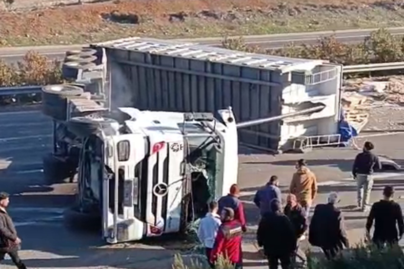 Gaziantep'in Nizip Otoyolu'nda fayans yüklü tır henüz bilinmeyen bir nedenle devrildi