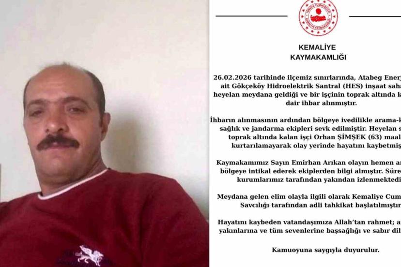 Açıklamada, Kemaliye ilçesinde, Atabeg Enerji A.Ş.’ye ait Gökçeköy Hidroelektrik Santral (HES) inşaat sahasında heyelan meydana geldiği ve bir işçinin toprak altında kaldığı yönünde ihbar alındığı belirtildi.