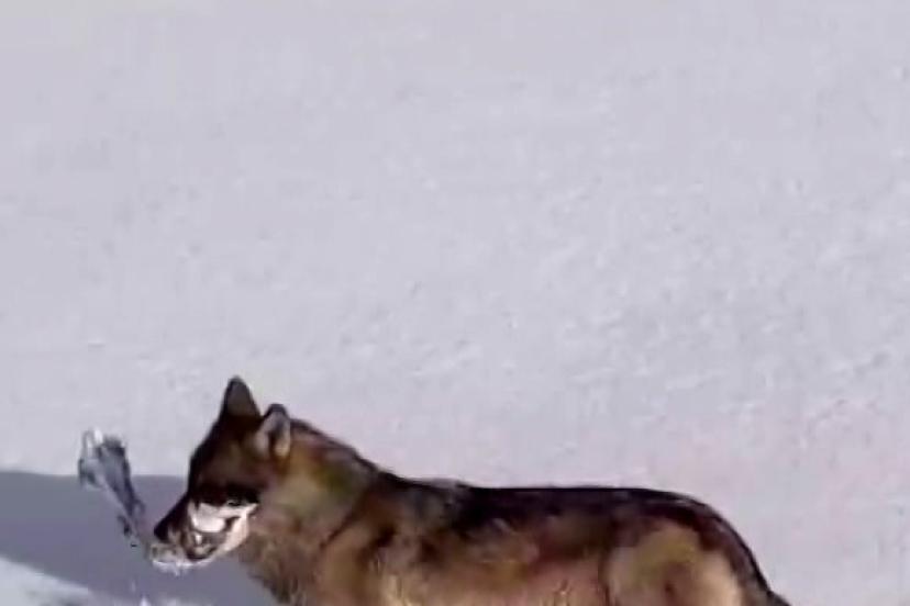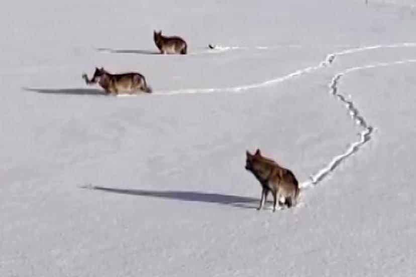 Kurtlar karlı arazide ağzında kemikle görüntülendi