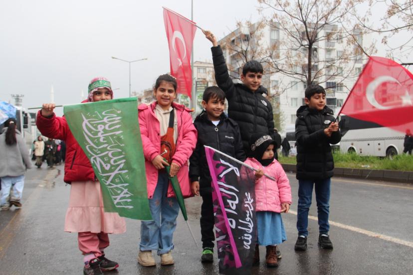 Diyarbakır'da düzenlenen Mevlid-i Nebi mitinginde çocuklar ve gençler ön plandaydı. Sağanak yağışa rağmen alanı dolduran minikler, Peygamber sevgisinin fedakârlık ve kararlılık gerektirdiğini vurguladı.