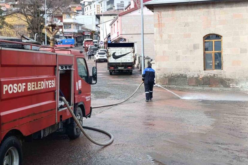 Ardahan’ın Posof ilçesinde, karın erimesiyle itfaiye ekipleri tarafından cadde ve sokaklar tazyikli suyla temizlendi.