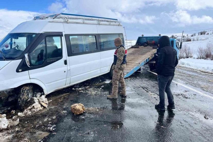 Elazığ’da yoğun kar yağışından dolayı şarampole sürüklenen minibüs, jandarma ve il özel idaresi ekipleri tarafından kurtarıldı.
