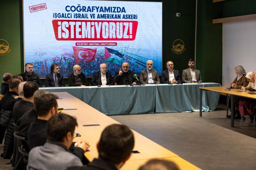 basın toplantısında bir konuşma yapan Filistin'e Destek Platformu Başkanı Osman Nuri Kabaktepe, "Siyonist rejimin Amerika ile birlikte İran'a ve bölgemize yönelik saldırılarının hem karşısında olduğumuzu hem de bölgemizi işgal etmeye yönelik çabalarının sadece bölgeye değil, dünyaya da istikrarsızlık getirdiğini, bu yapılanlara hayır dediğimizi ve durduğumuz yerin belli olması adına pazar günü hep beraber gördüğümüzü, körleşmediğimizi, duyduğumuzu, sağırlaşmadığımızı göstermek için tüm İstanbullu kardeşlerimizi yürüyüşümüze davet ediyoruz." şeklinde konuştu.