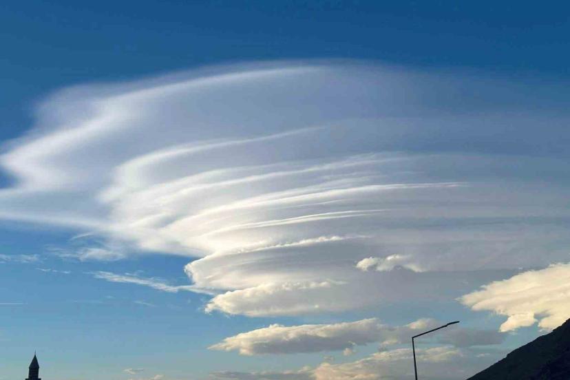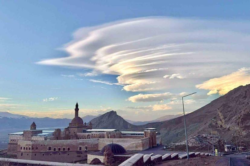 Ağrı’nın Doğubayazıt ilçesinde İshak Paşa Sarayı üzerinde oluşan mercek bulutları, gökyüzünde görsel şölen sundu.