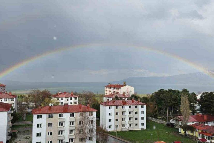Tatvan’da gün içerisinde etkisini sürdüren yağmur, yerini kısa süreli güneşli havaya bırakınca doğa adeta renk cümbüşüne sahne oldu. Yağışın ardından oluşan gökkuşağı, özellikle Van Gölü’nün üzerinde belirgin şekilde görülürken, Tatvan ilçe merkezinden de net bir şekilde izlenebildi. Göl yüzeyine yansıyan gökkuşağı eşsiz görüntüler ortaya çıkarırken, manzarayı gören vatandaşlar ise cep telefonlarına sarılarak bu anları ölümsüzleştirdi. Şehrin birçok noktasında gökyüzünü süsleyen renkler, kısa sürede ilgi odağı oldu.