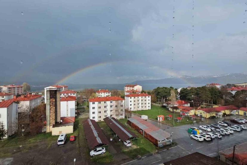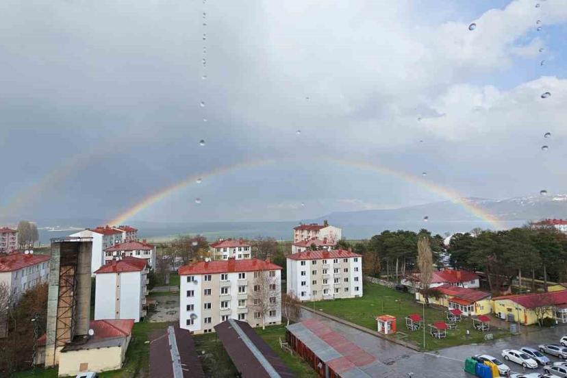 Bitlis’in Tatvan ilçesinde etkili olan yağışların ardından ortaya çıkan gökkuşağı, Van Gölü ve şehir merkezi üzerinde güzel görüntüler oluşturdu.