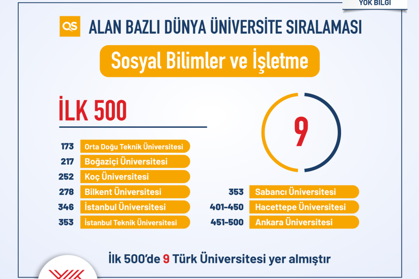 “Sosyal Bilimler ve İşletme” alanında ODTÜ 173., Boğaziçi Üniversitesi 217., Koç Üniversitesi 252., Bilkent Üniversitesi 278., İstanbul Üniversitesi 346., İTÜ ve Sabancı Üniversitesi 353. oldu. Hacettepe Üniversitesi 401-450, Ankara Üniversitesi 451-500 bandında yer aldı. Böylece bu alanda toplam 9 üniversite ilk 500’e girdi.